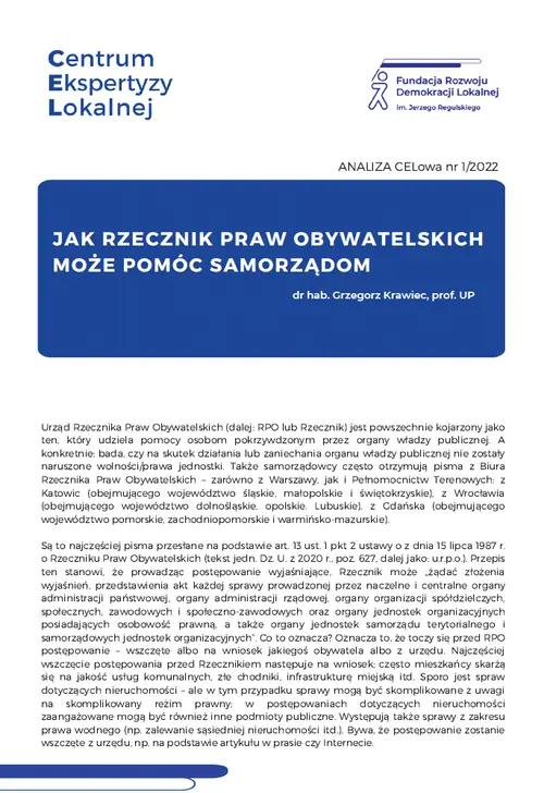 Warto pamiętać, że Rzecznik Praw Obywatelskich może działać również na rzecz samorządów. Organy samorządu terytorialnego są, co prawda, elementem władzy publicznej, (przed którą ma chronić jednostkę Rzecznik), jednak i one same z tej pomocy Rzecznika mogą skorzystać. Nic nie stoi zatem na przeszkodzie, by i samorządy zwracały się do Rzecznika z prośba o pomoc, gdy ich prawa są naruszane. Gmina, powiat i województwo są osobami prawnymi, posiadającymi samodzielność. Samodzielność ta, a także ich wolności i prawa mogą być naruszane przez inne organy władzy publicznej, a nawet przez parlament (który może uchwalić ustawy godzące w samorząd). Więcej informacji w ANALIZIE CELowej przygotowanej przez dr hab. prof. UP Grzegorza Krawca.
