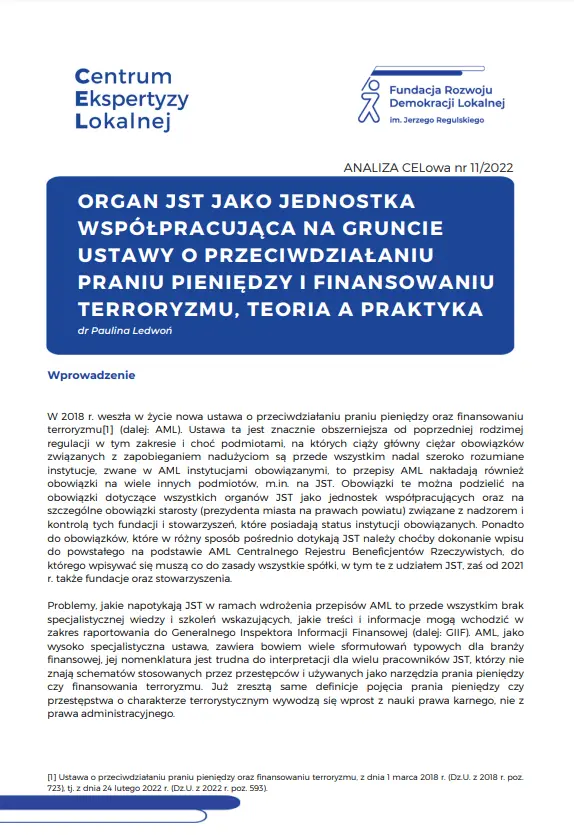 Ustawa o przeciwdziałaniu praniu pieniędzy oraz finansowaniu terroryzmu nakłada wiele obowiązków na JST. Przedstawiciele samorządu terytorialnego napotykają podczas wdrożenia przepisów ustawy wiele problemów. Barierą jest brak specjalistycznej wiedzy i szkoleń wskazujących, jakie treści i informacje mogą wchodzić w zakres raportowania do Generalnego Inspektora Informacji Finansowej. Poza tym wysoko specjalistyczna ustawa, o której mowa zawiera bowiem wiele sformułowań typowych dla branży finansowej, jej nomenklatura jest po prostu trudna do interpretacji dla wielu pracowników JST, którzy nie znają schematów stosowanych przez przestępców i używanych jako narzędzia prania pieniędzy czy finansowania terroryzm. Więcej w analizie dr Pauliny Ledwoń Organ JST jako jednostka współpracująca na gruncie ustawy o przeciwdziałaniu praniu pieniędzy oraz finansowaniu terroryzmu.