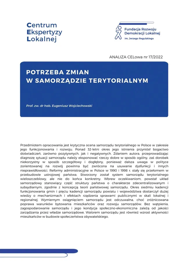 Od początku istnienia samorządu jego instytucja działa w ustroju i w systemie ekonomicznym, które powodują wiele dysfunkcji i nieprawidłowości, skutkujących wyższymi kosztami realizacji zadań własnych lub nie do końca rozwiązanymi problemami społecznymi. Degradacja i powierzchowność życia publicznego w Polsce, przy nieskutecznych systemach zarządzania sprawami publicznymi (w państwie i samorządzie) wpływały i wpływają nadal na kondycję społeczną oraz ekonomiczną jednostek samorządowych. W samorządzie terytorialnym rozwiązano do tej pory więcej problemów społecznych niż w skali kraju. Przez cały czas istnienia samorządu, nie stworzono jednak stabilnych warunków funkcjonowania struktur samorządowych. Więcej o potrzebie zmian w samorządzie terytorialnym w analizie prof. zw. dr hab. Eugeniusza Wojciechowskiego.