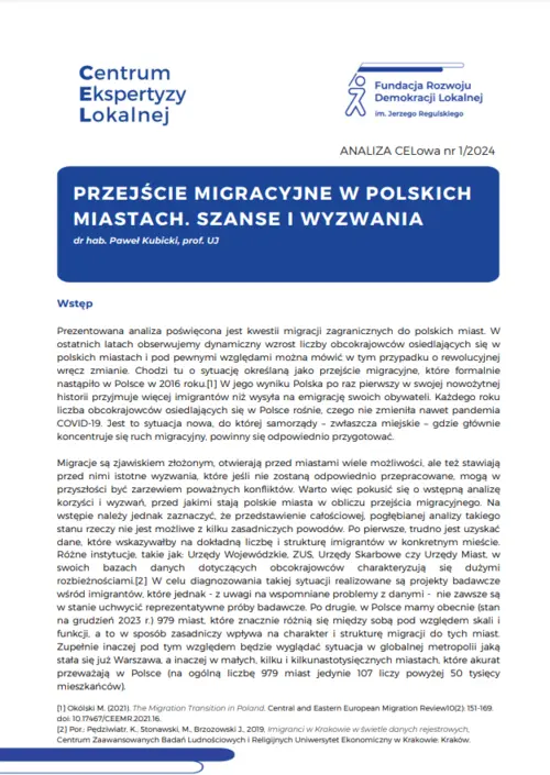 W ostatnich latach obserwujemy dynamiczny wzrost liczby obcokrajowców osiedlających się w polskich miastach. Pod wieloma względami tendencja ta jest rewolucyjna, a tzw. przejście migracyjne, które nastąpiło w Polsce w 2016 r. oznacza, że Polska po raz pierwszy w swojej nowożytnej historii przyjmuje więcej imigrantów niż wysyła na emigrację swoich obywateli.