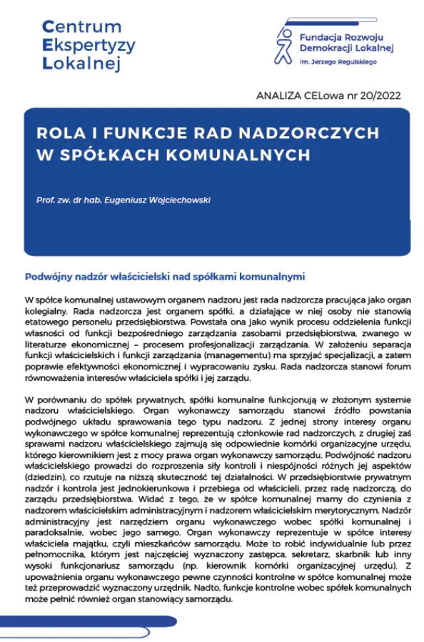 W spółce komunalnej ustawowym organem nadzoru jest rada nadzorcza pracująca jako organ kolegialny. Rada nadzorcza jest organem spółki, a działające w niej osoby nie stanowią etatowego personelu przedsiębiorstwa. Rady nadzorcze spółek komunalnych mają charakter polityczny z racji ich wyboru przez organ wykonawczy samorządu terytorialnego. To on decyduje, kto w jego imieniu będzie reprezentować interesy samorządu w działalności spółki. Więcej w analizie prof. zw. dr hab. Eugeniusz Wojciechowski "Rola i funkcje rad nadzorczych w spółkach komunkalnych"