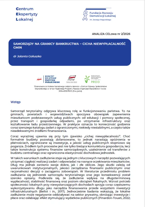 Samorządy lokalne coraz częściej funkcjonują na granicy swojej finansowej wytrzymałości. O formalnych bankructwach gmin słyszymy rzadko, w praktyce jednak coraz częściej pojawia się zjawisko „cichej niewypłacalności”: budżet na papierze pozostaje zbilansowany, lecz narastają opóźnienia w płatnościach, odkładane są inwestycje, a jakość usług publicznych stopniowo się obniża.