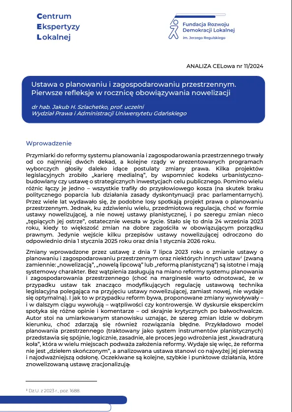 Dnia 24 września 2023 roku weszła w życie – przez niektórych wyczekiwana, przez niektórych kontestowana – reforma planistyczna, która dokonała istotnych zmian w prawie, a w szczególności w ustawie o planowaniu i zagospodarowaniu przestrzennym. W opracowaniu przedstawione zostały kluczowe zmiany, a także dysfunkcje ustawy coraz silniej widoczne w rocznicę jej obowiązywania. Ustawodawca powinien przeprowadzić pilną i punktową nowelizację, by zapewnić gminom odpowiednie warunki do wdrażania jej ustaleń. Nie oznacza to rzecz jasna, że nie ma potrzeby prowadzenia „pogłębionej refleksji” w zakresie nie tyle co ustawy o planowaniu i zagospodarowaniu przestrzennym, ile całego systemu planowania i zagospodarowania przestrzennego (wszak ten jest silnie rozproszony po co najmniej kilkudziesięciu ustawach i rozporządzeniach). Są jednak sprawy, które należy rozstrzygnąć w pierwszej kolejności.