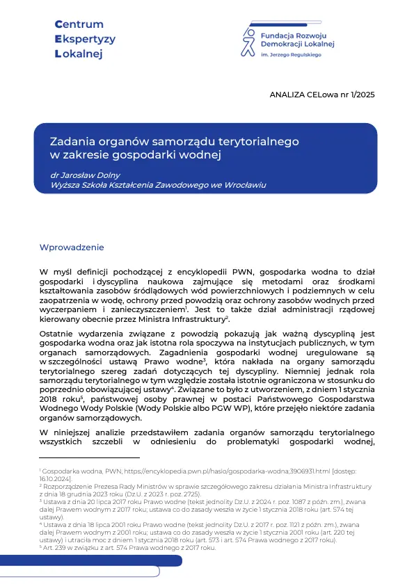 W przedstawionej analizie omówiono i przeanalizowano zadania jednostek samorządu terytorialnego na wszystkich szczeblach (gminy, powiatu, województwa) w obszarze gospodarki wodnej, wynikające przede wszystkim z przepisów ustawy Prawo wodne. Na podstawie przeprowadzonych badań dokonano porównania obecnego stanu prawnego z wcześniejszym porządkiem prawnym, wskazując, jak zmieniły się regulacje dotyczące tego obszaru.